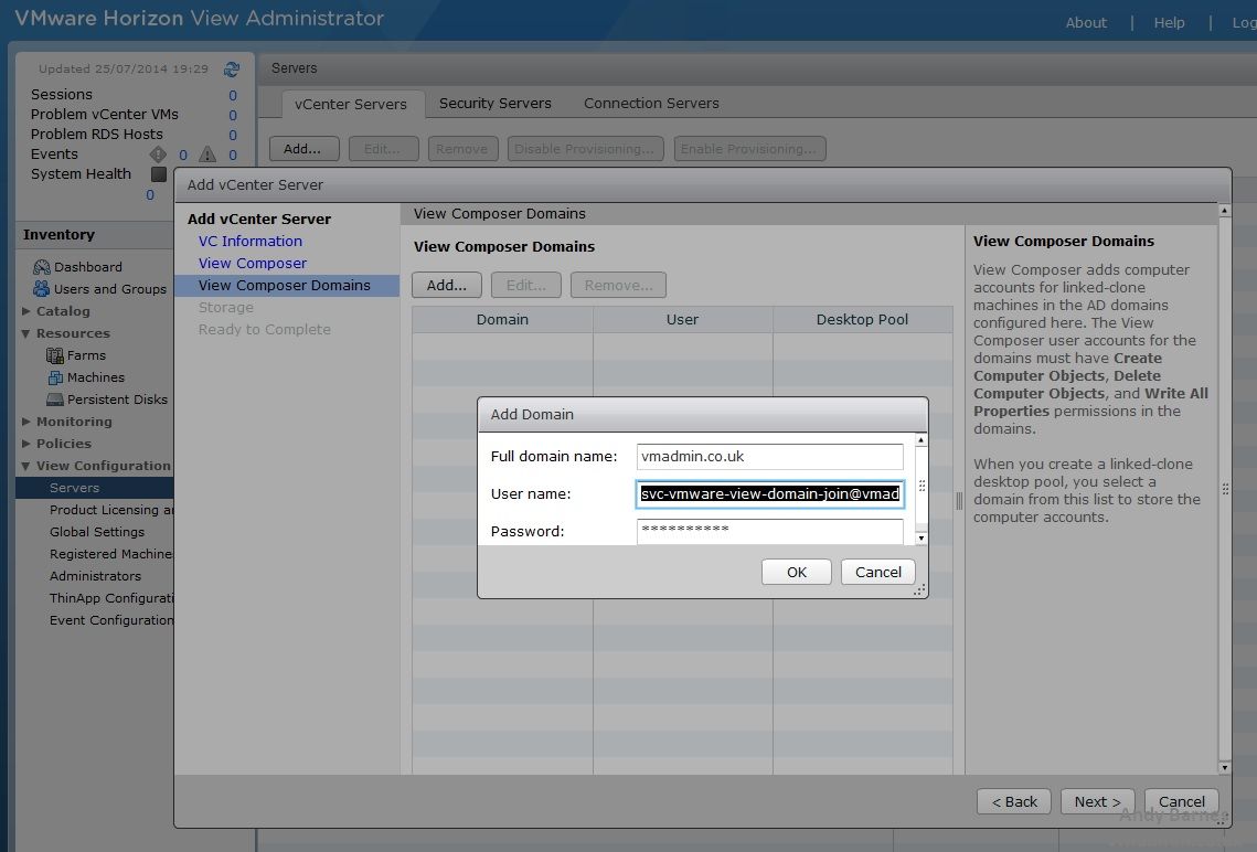 We are now going to proceed configuring the service accounts for View to connect to vCenter and join desktops to the domain followed by the events database. Additionally we need to create an OU and delegate permissions on this OU.