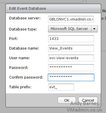 The View events database is a SQL database which stores information for events such as auditing of administration changes within View administrator, problems connecting to components and services such as Composer or vCenter and also user events such as connecting to a desktop.
